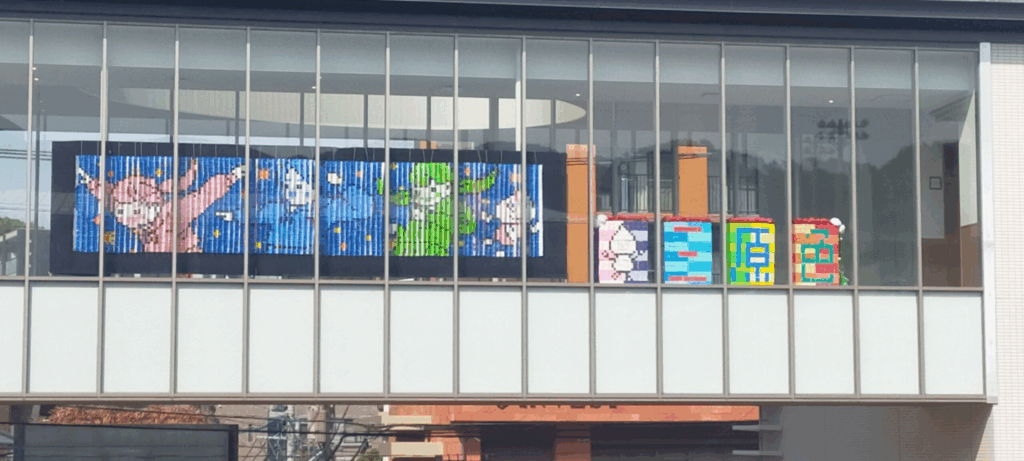 この写真は、空中回廊に飾られた看板で、全校生徒が参加して作ったものです。